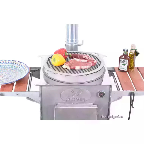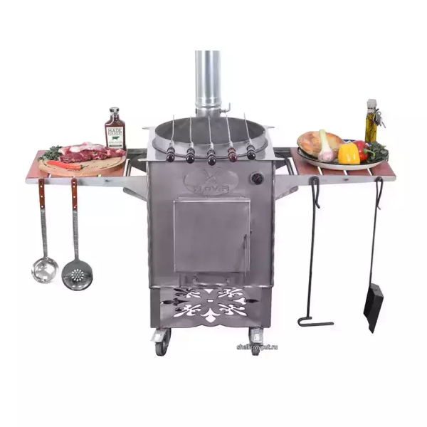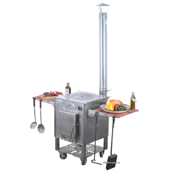 Очаг оснащен боковыми столиками, на которых можно разместить продукты, кухонную утварь, топливо. Поставляется вместе с дымоходом, через который быстро удаляется весь дым. Также очаг оснащен зольником, топкой, дверкой.
