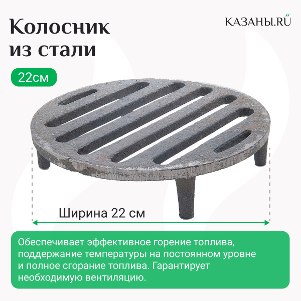 Колосник из стали (d 22) - топочный элемент в тандыре, который подвергается воздействию высоких температур. Он отводит золу, пропускает воздух, способствует равномерному распределению жара и сгоранию угля. Изделие изготовлено из надежной стали по стандартам, которые разработаны для печного литья. Колосник укладывают в топочную область, сверху на него укладывают дрова, уголь.