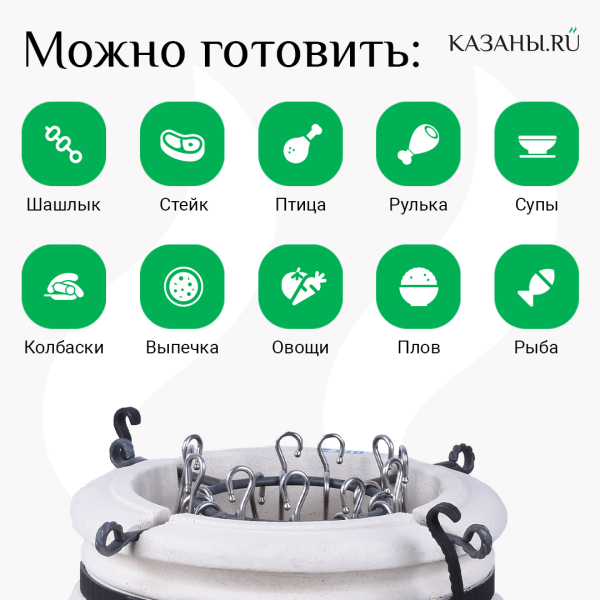 Если аксессуаров не хватает, всегда можно подобрать дополнительные, учитывая при этом диаметр горловины. Для тандыров есть чугунки, решетки и этажерки, специальные формы для рыбы, камни для приготовления лепешек и другой выпечки, крючки для дичи. В печи блюда получают особый вкус, который сложно с чем-либо сравнить.