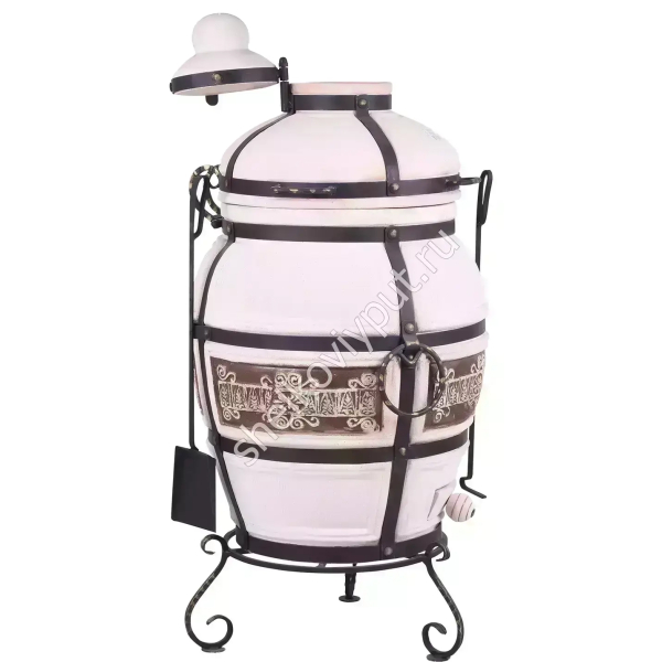 Печь имеет форму бочонка, ее стенки усилены кованым каркасом. Металлические обручи защищают тандыр от механического разрушения. Преимущества очага: