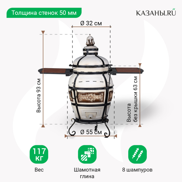 Высота тандыра с крышкой - 93 см, без крышки - 63 см. Диаметр жаровни в широкой части - 55 см, горловины - 32 см. Толщина стенок - от 5 см. Большое отверстие горловины позволяет использовать в тандыре емкие аксессуары: большие этажерки, камни с увеличенным диаметром, чугунки.