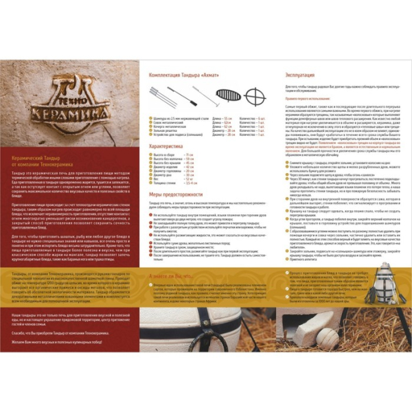 Высота тандыра с крышкой - 75 см, без крышки - 51 см. Ширина жаровни - 45 см, горловины - 21 см. Толщина стенок очага - 4 см. В процессе эксплуатации на поверхности тандыра образуется тонкая сеточка из микротрещин - через них в камеру поступает дополнительный воздух. Это не дефект, не нужно волноваться. Прочность стенок гарантирована металлическим кованым каркасом.