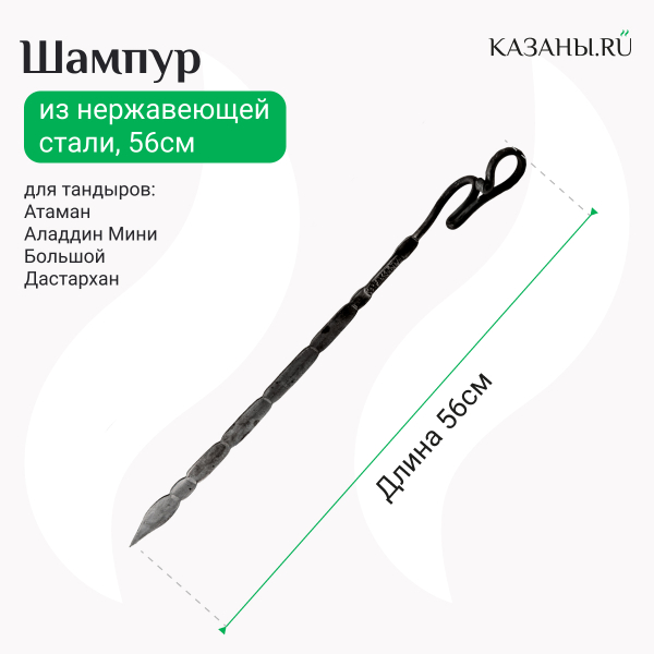 Жаровня укомплектована 12 шампурами, подставкой под крышку, аксессуаром для подвешивания шампуров, совком, чугунным колосником, кочергой. В комплекте также имеется подставка под тандыр. Поверхность печи украшена узорами, стенки с толщиной 8 см усилены металлическим кованым каркасом и ручками. В подставках предусмотрены красивые завитки.